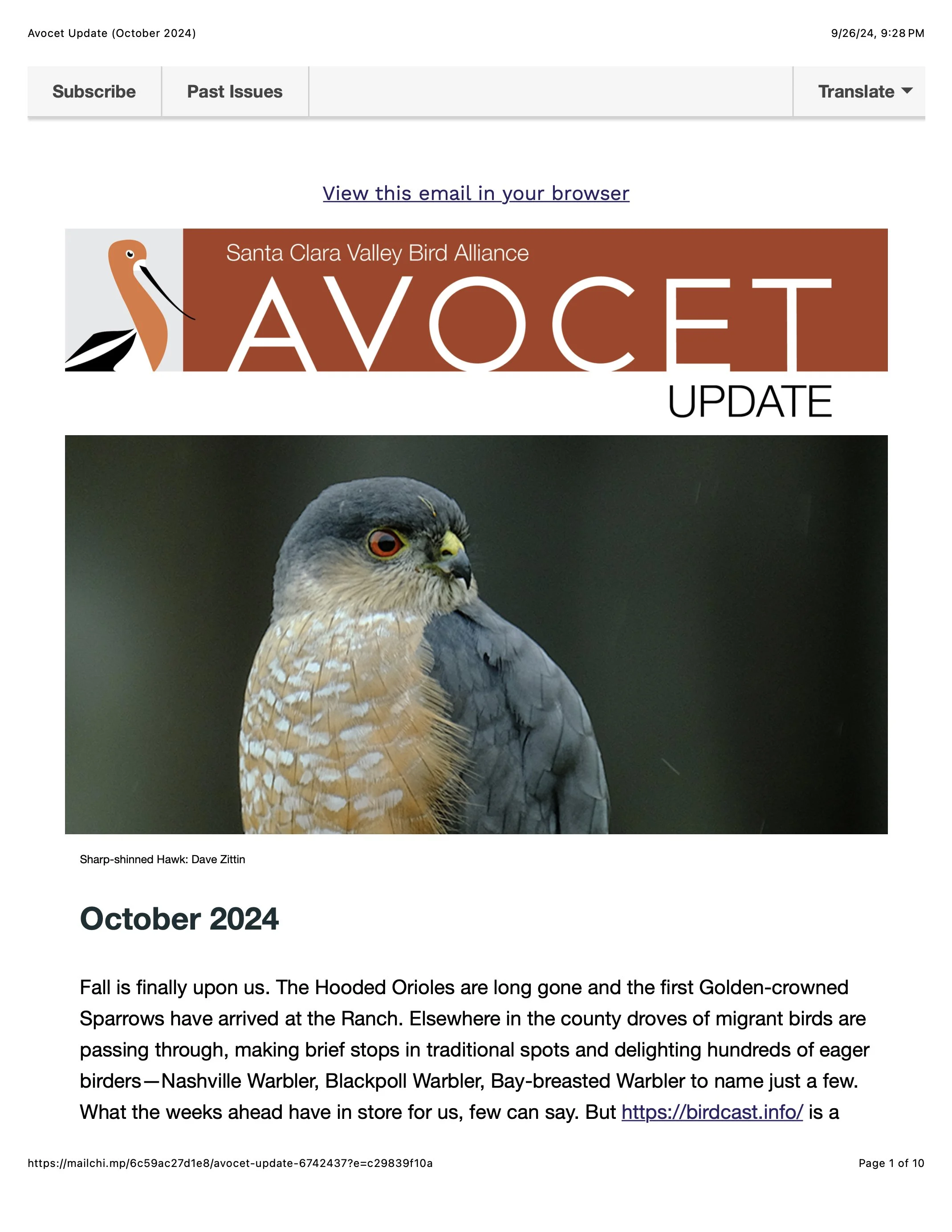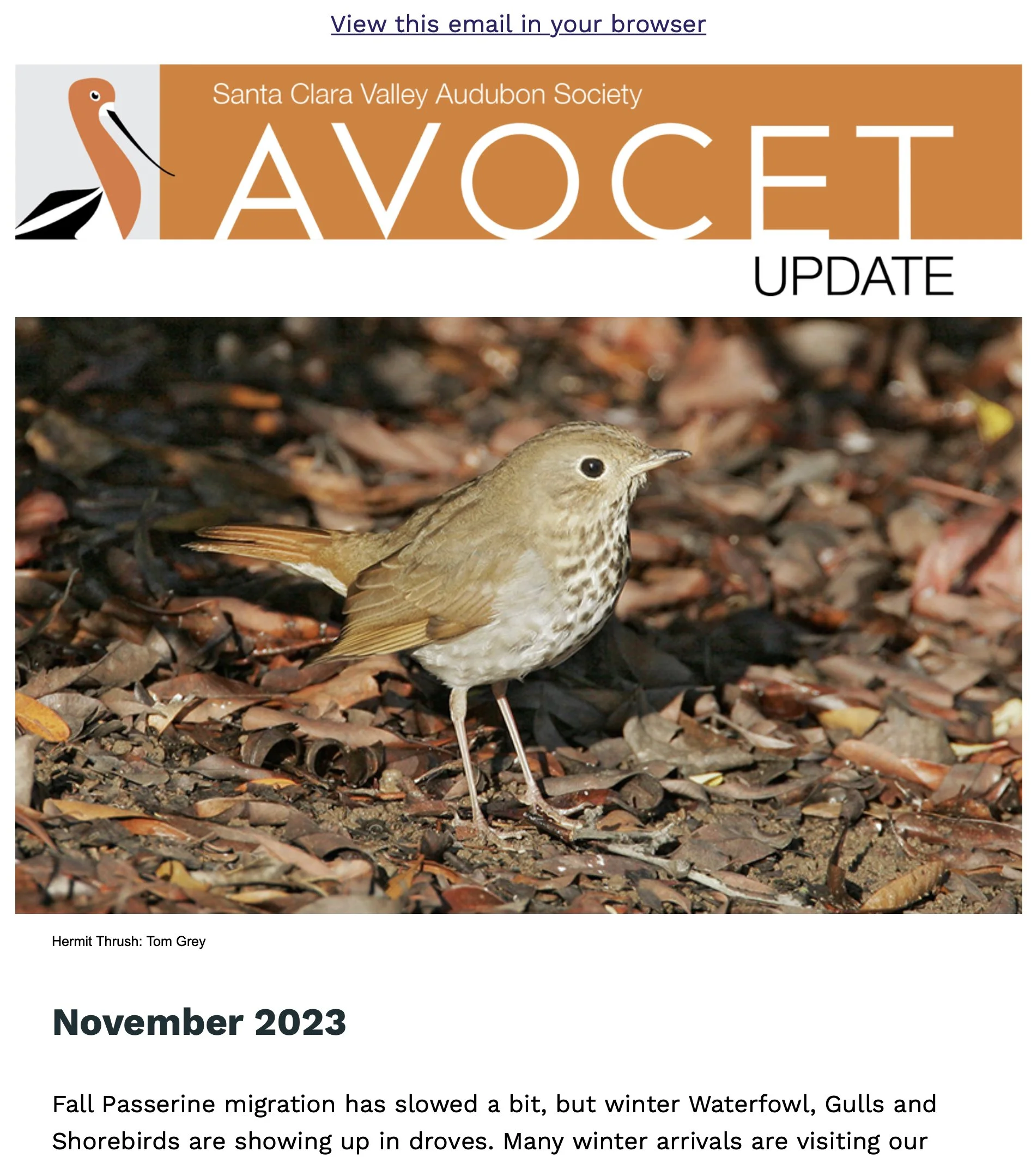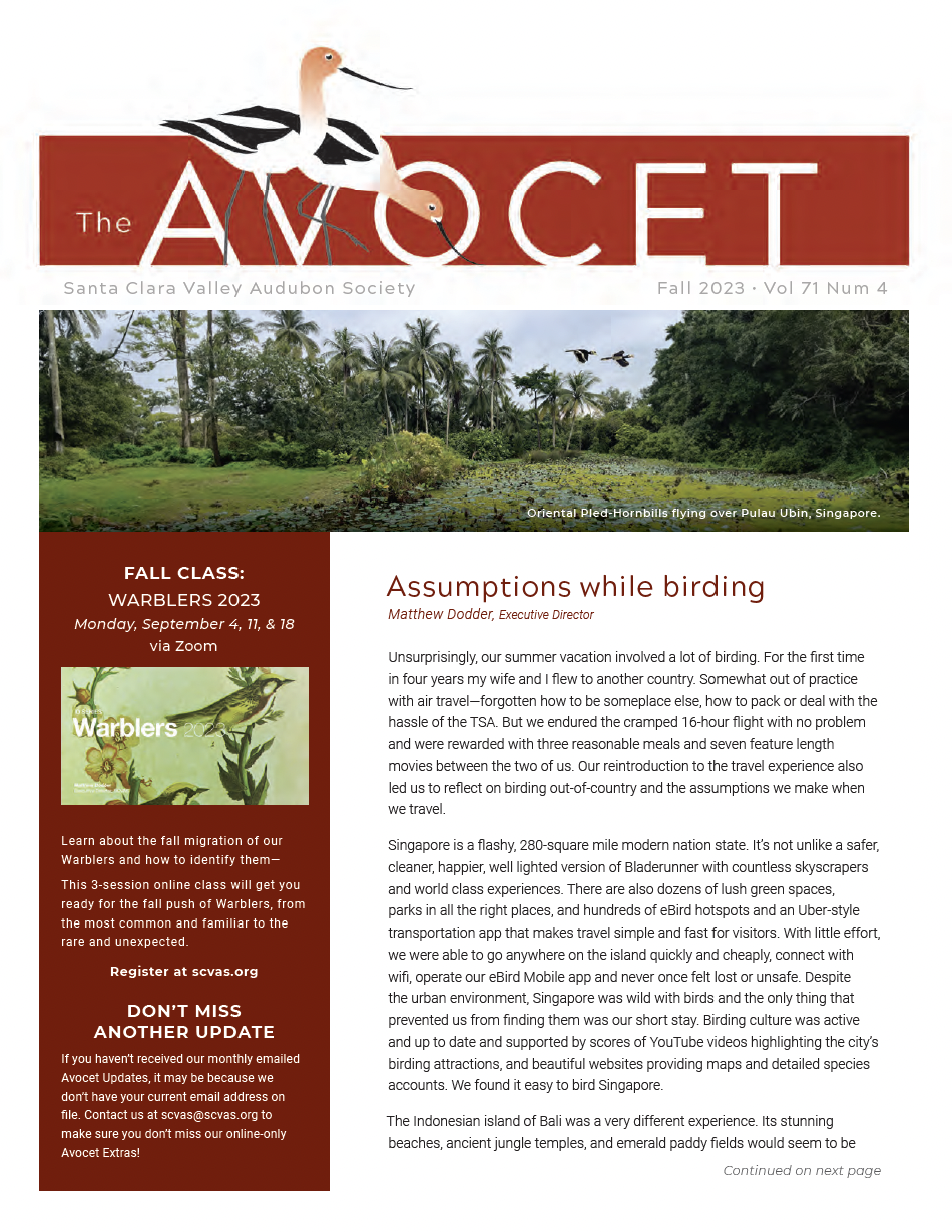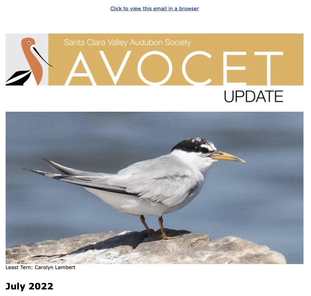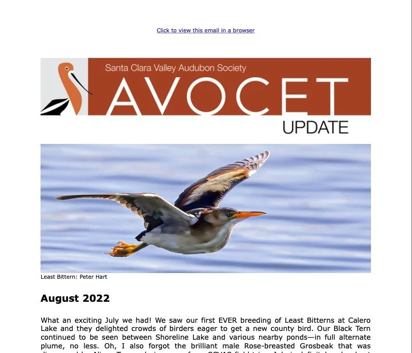 The Santa Clara Valley Bird Alliance’s main publication is The Avocet, which is produced quarterly. The Avocet Update is a monthly email with additional timely information about what’s happening in our county.
