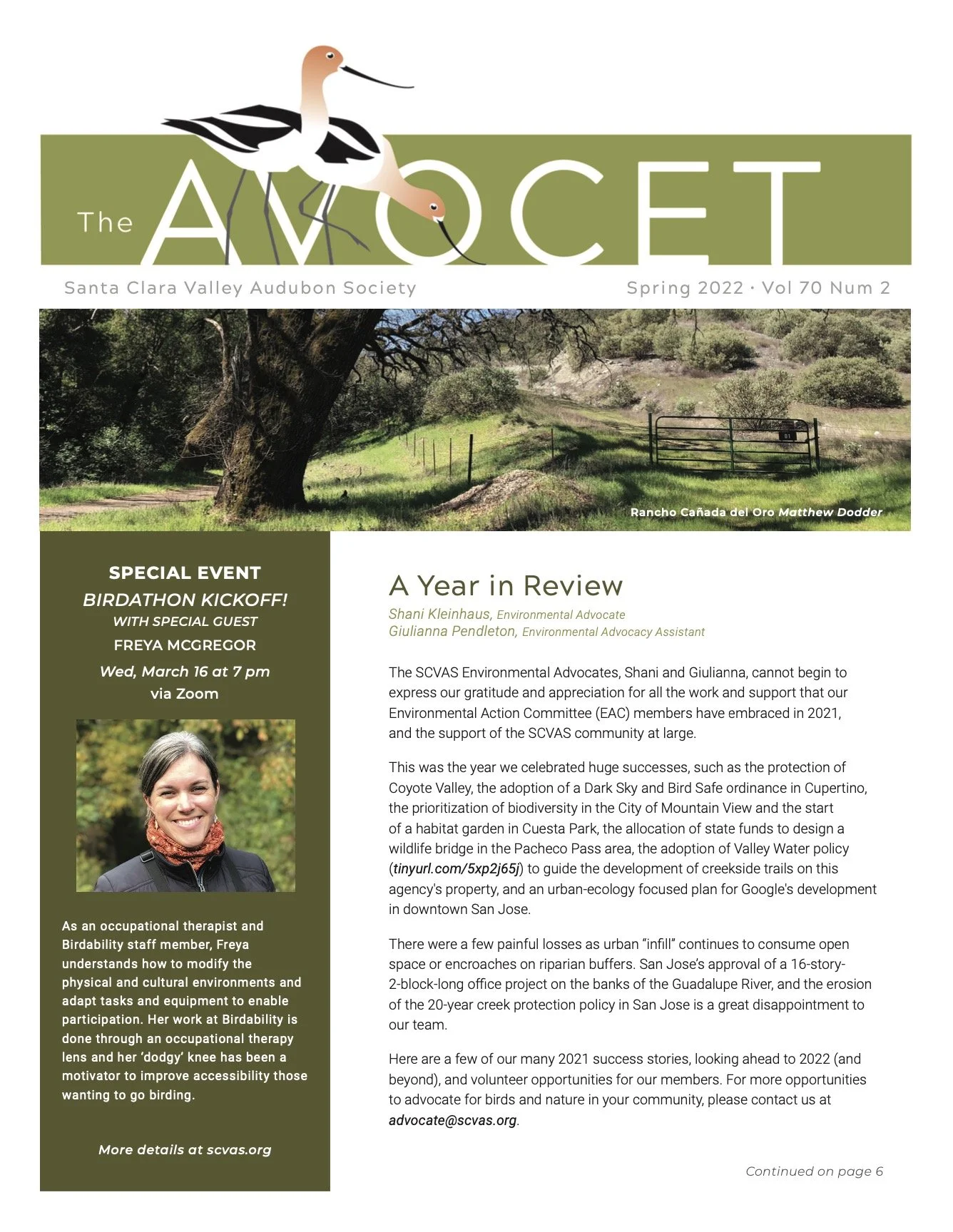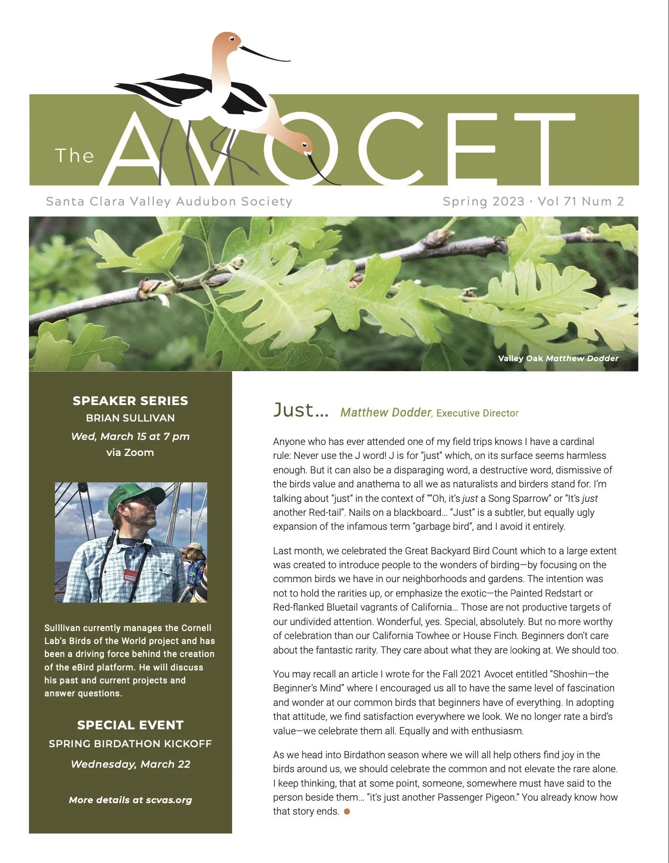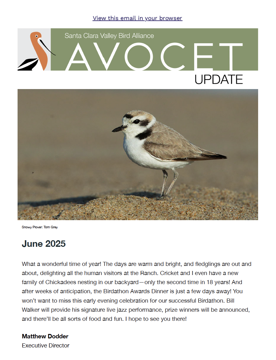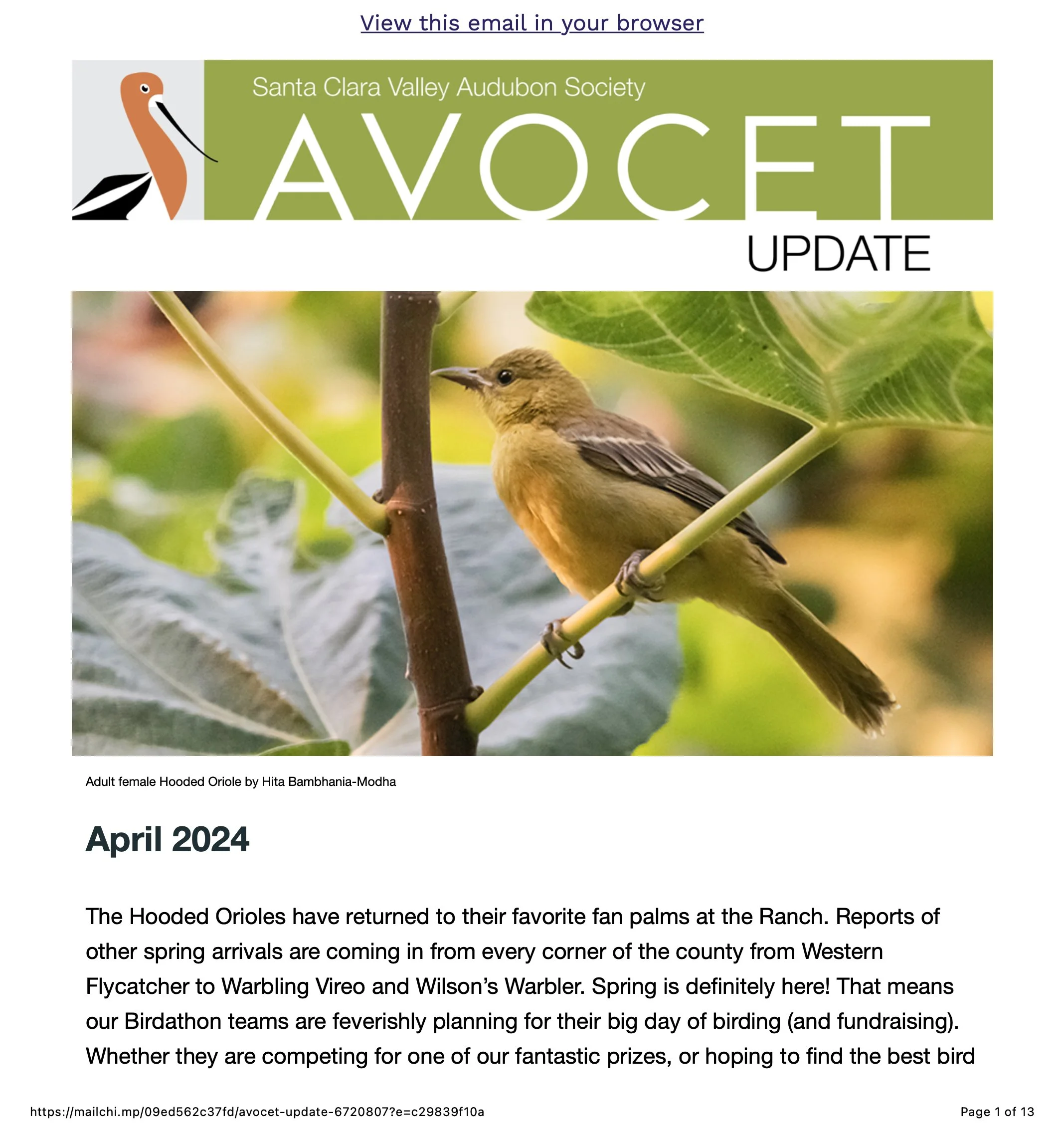 The Santa Clara Valley Bird Alliance’s main publication is The Avocet, which is produced quarterly. The Avocet Update is a monthly email with additional timely information about what’s happening in our county.