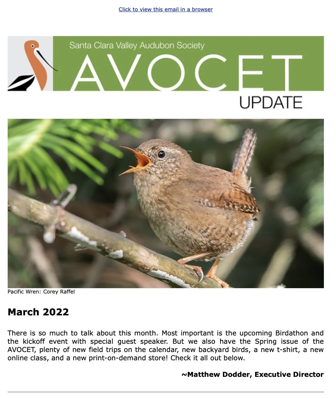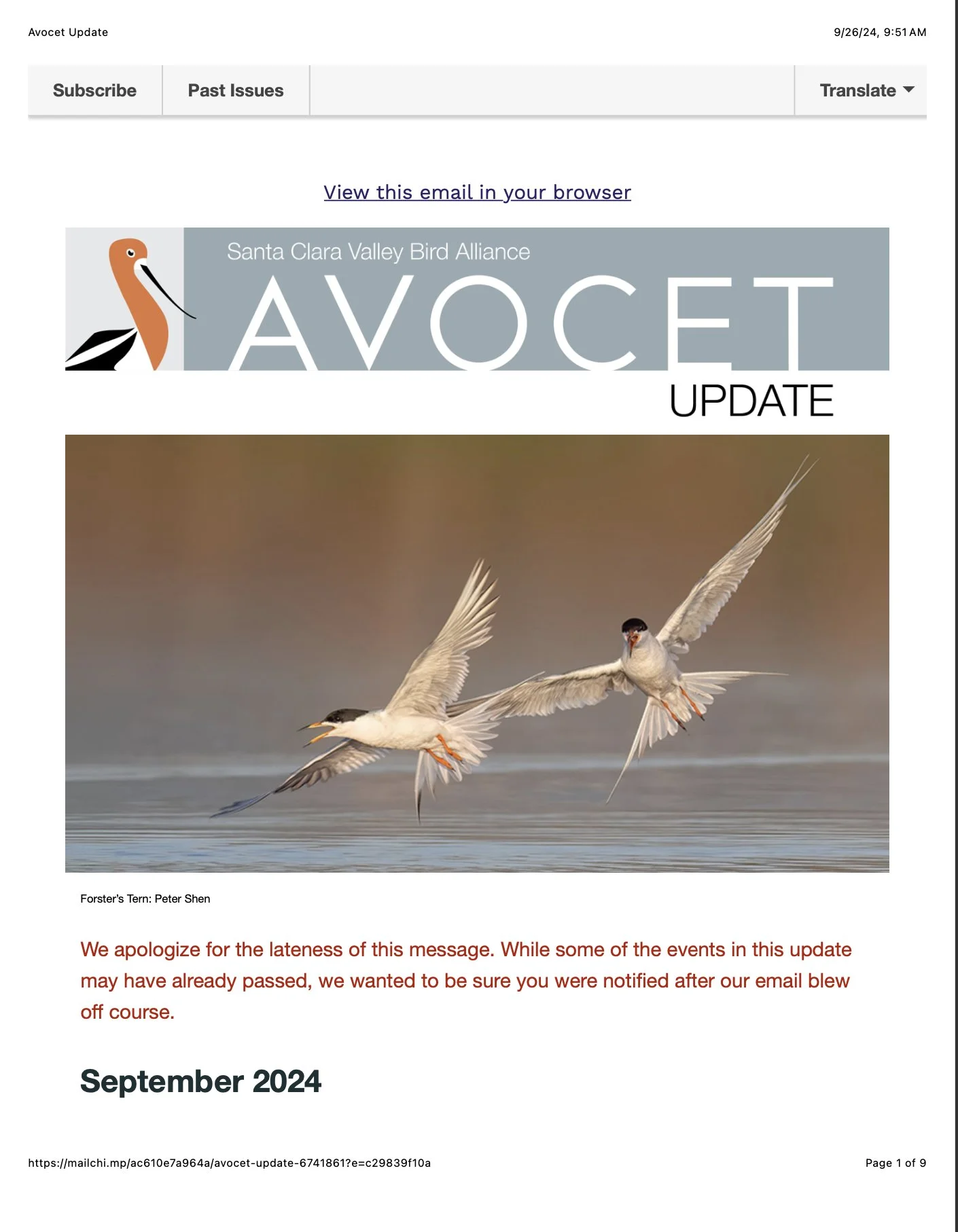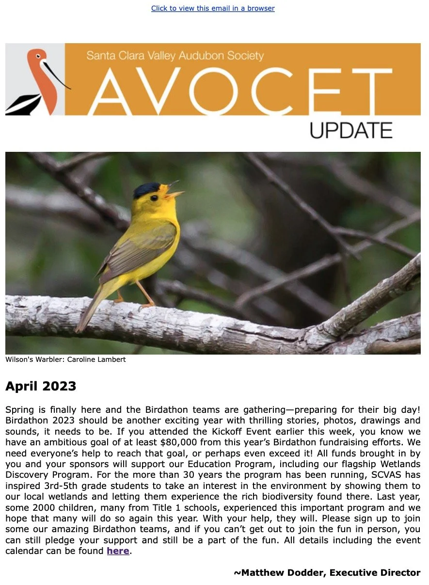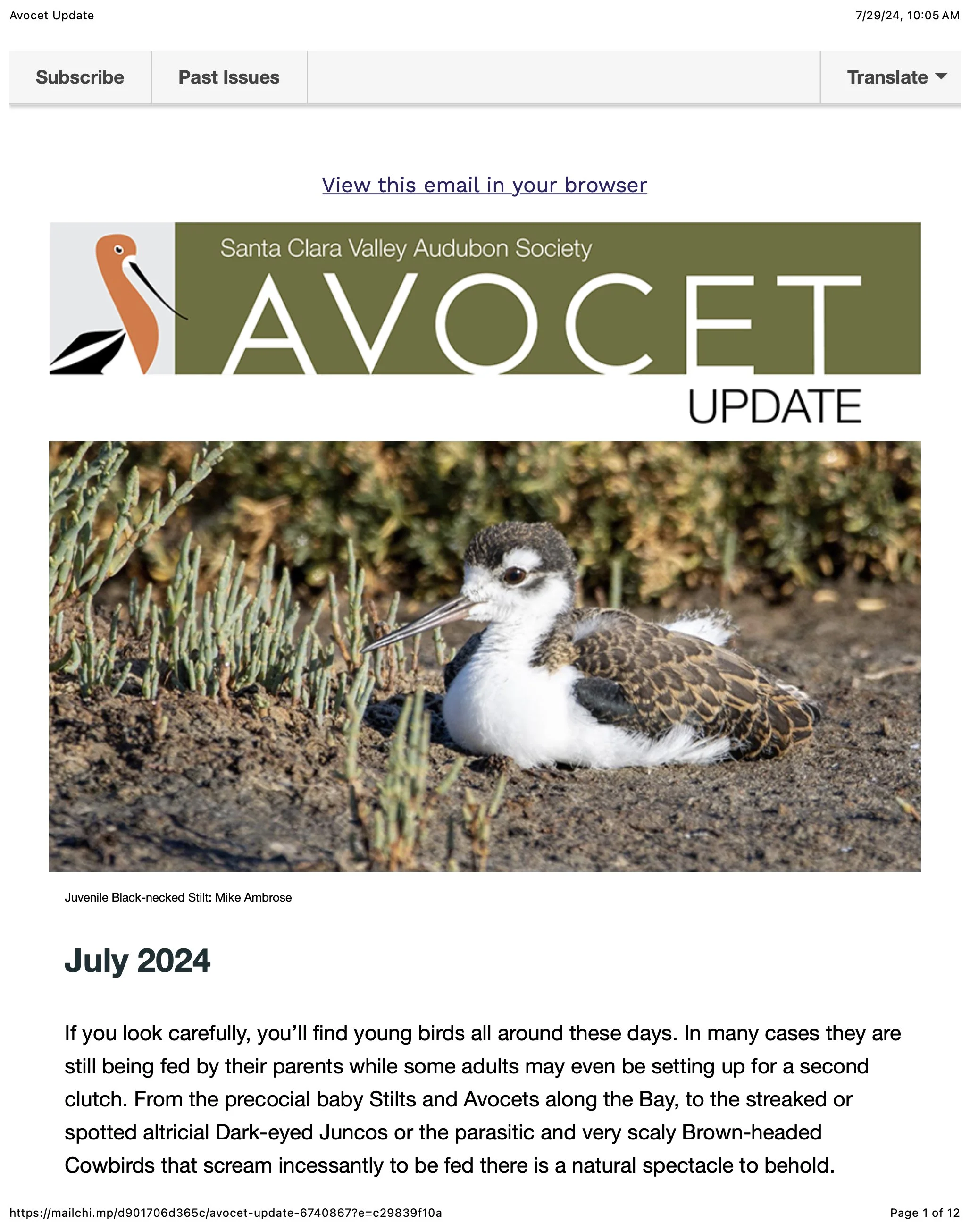 The Santa Clara Valley Bird Alliance’s main publication is The Avocet, which is produced quarterly. The Avocet Update is a monthly email with additional timely information about what’s happening in our county.