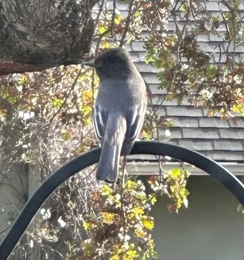“It was a Black Phoebe perched on a wire under our porch eave. It was right next to a porch light that I leave on all night for security reasons. The light attracts a lot of insects during the night. That’s one smart bird!”