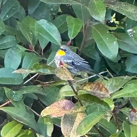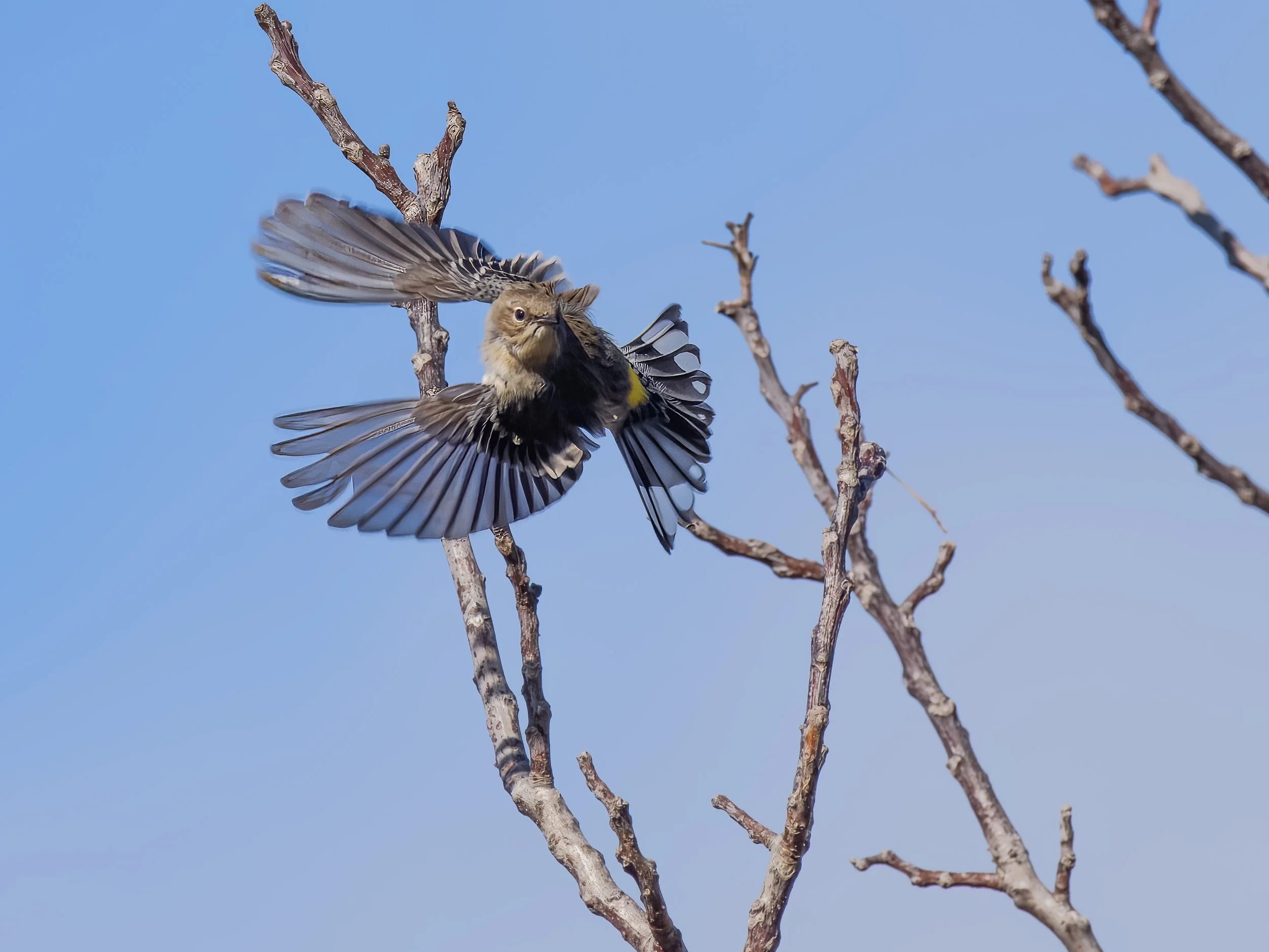 A Yellow-rumped Warbler takes flight, photographed by Deanne. Note the yellow patch on the bird’s lower back, from which it gets its name!