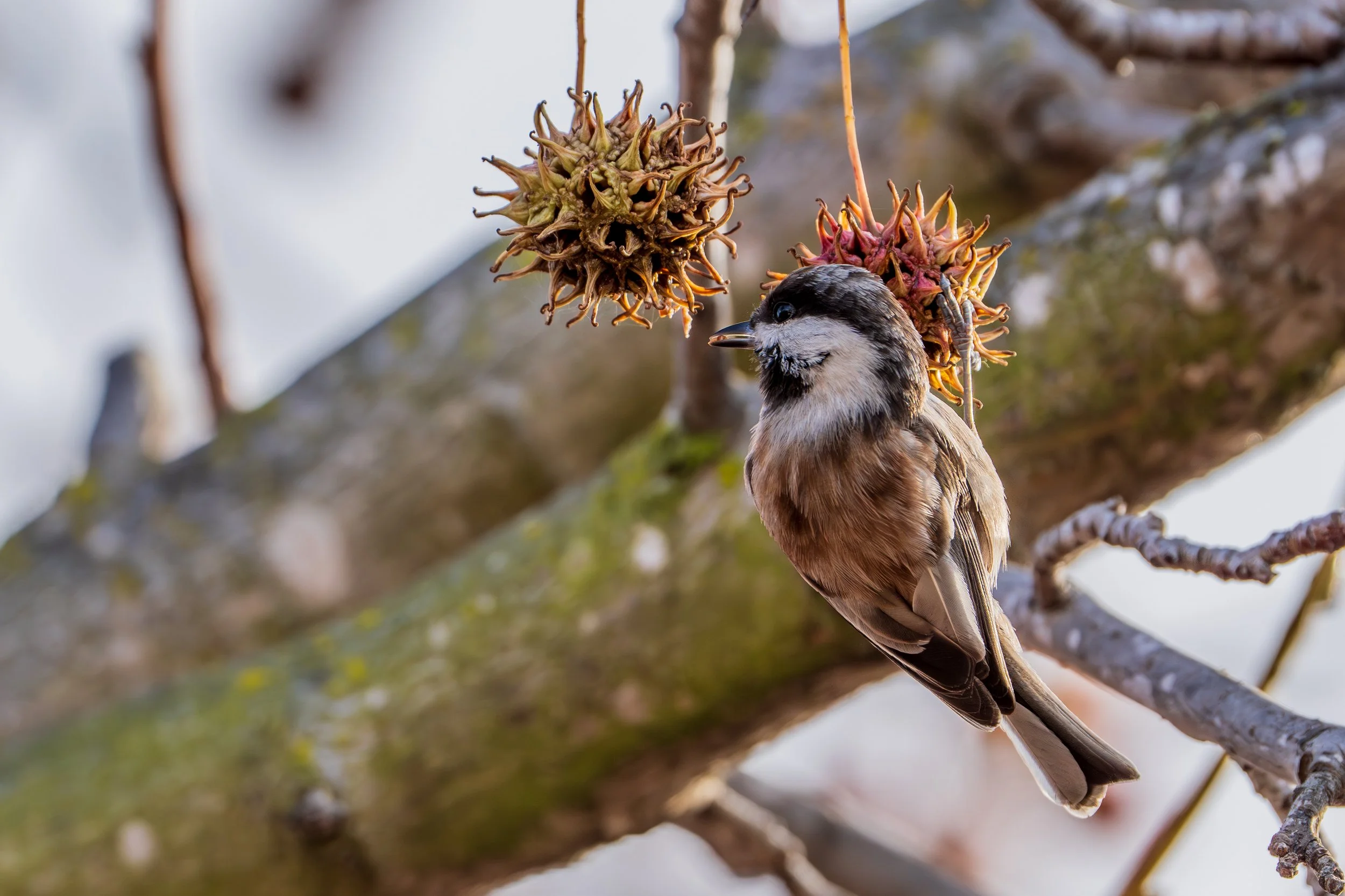This Chestnut-backed Chickadee has an unusual amount of white in its feathers and is possibly leucistic (lacking color pigmentation in some of its plumage). Because of its unusual color pattern, Molly recognizes it as an individual. In this picture, it is enjoying sweetgum seeds.