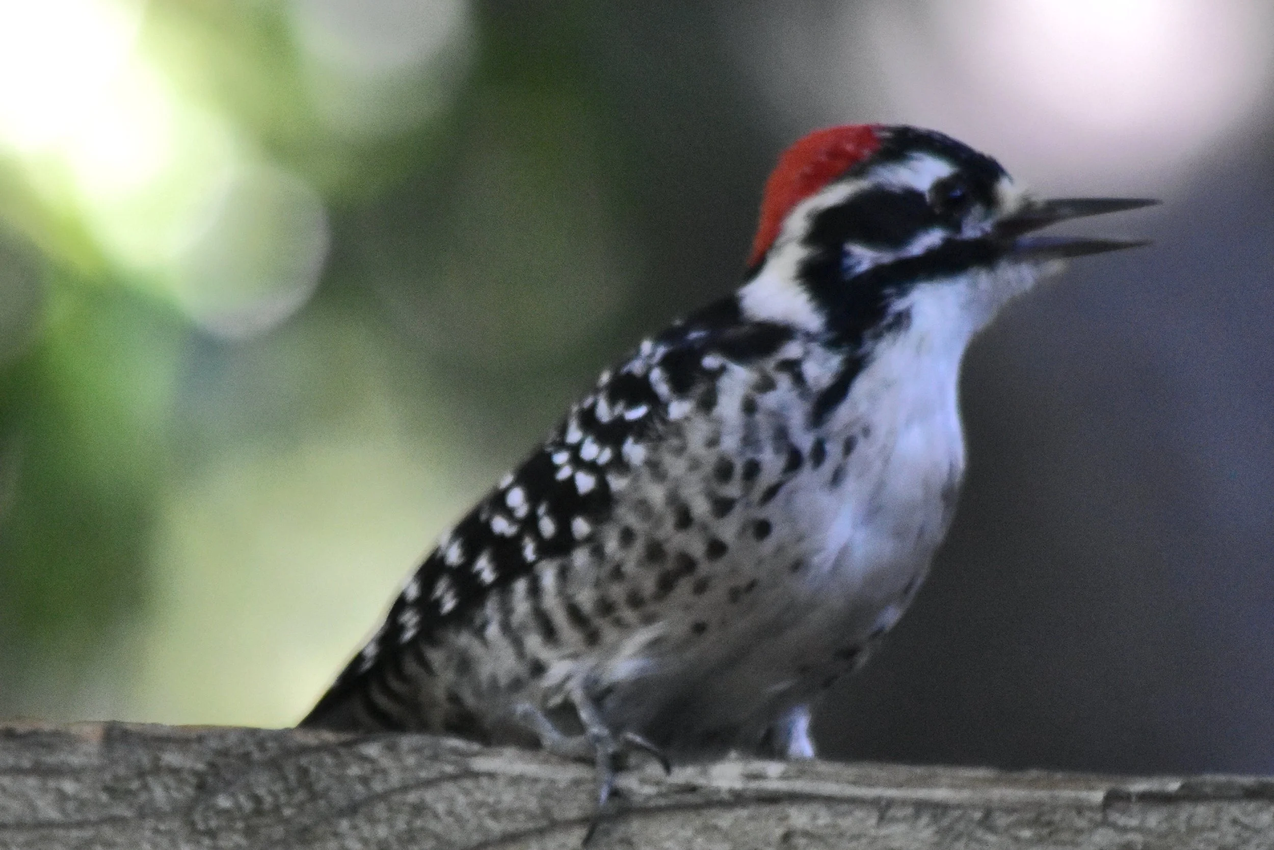 A Nuttall’s Woodpecker alerts Unice to his presence. Adult male Nuttall’s Woodpeckers have an extensive red patch on the back of the head.