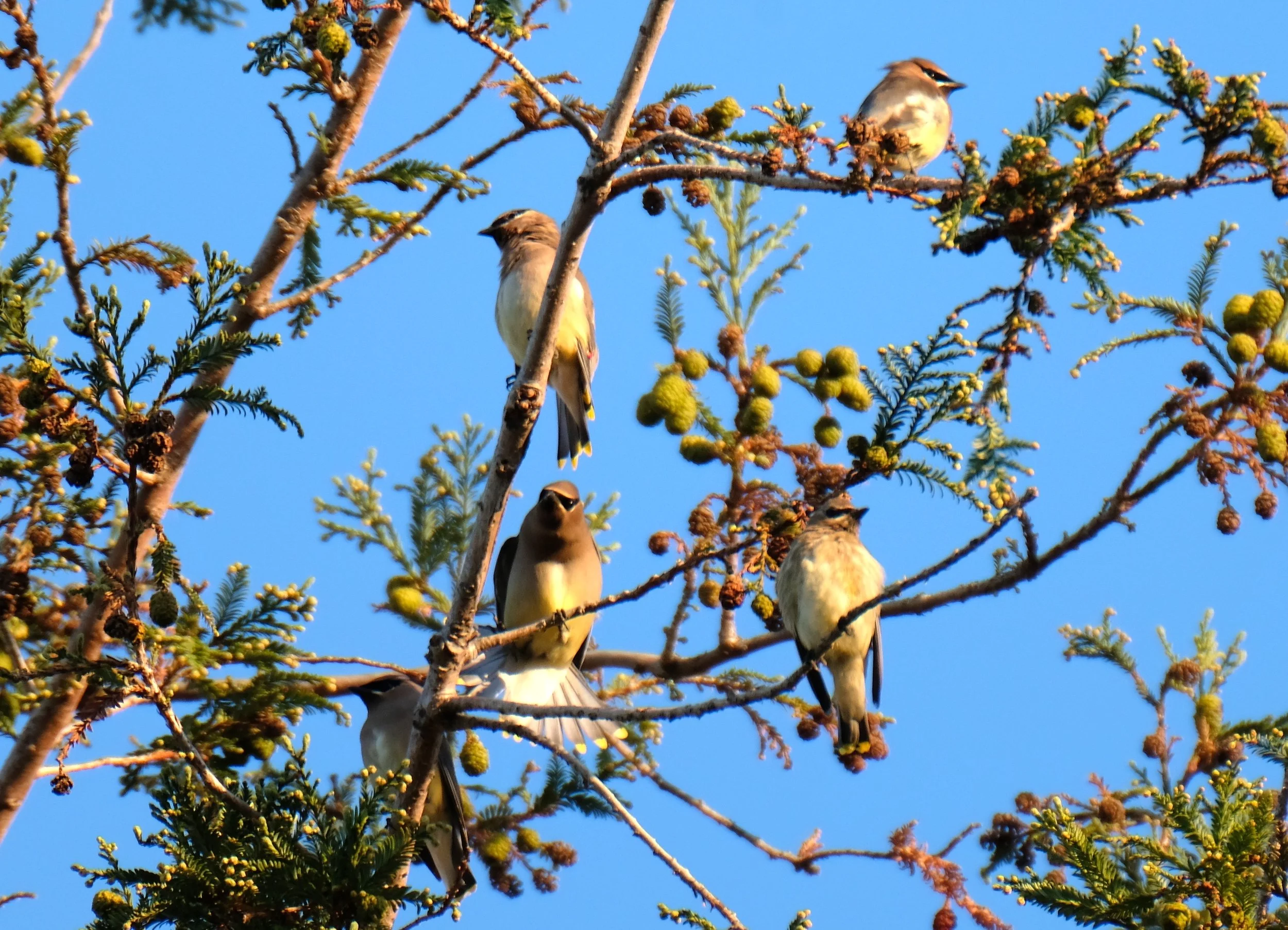 “Also, we have flocks of up to fifty Cedar Waxwings flying around the neighborhood, which I haven’t seen yet at nearby local hotspots.”