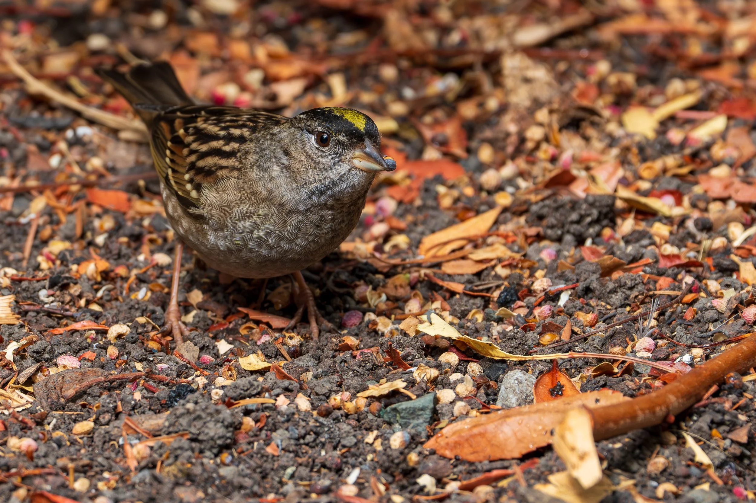 Emma spotted her first White-crowned Sparrow of the season in her yard on September 13. These sparrows have been continuously visiting her yard since September 28. She had her first Golden-crowned Sparrow of the season at the end of September. She writes: “Both Golden-crowned and White-crowned Sparrows hang out every year in the yard, gathering up what they can under the feeders and plants.”