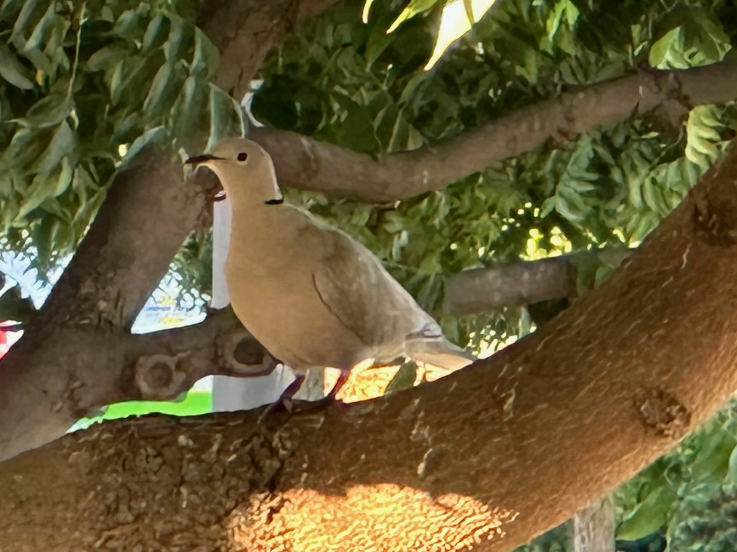 A Eurasian Collared-Dove near Kristin’s home. The thin black line on the back of the neck, or “collar,” is visible.