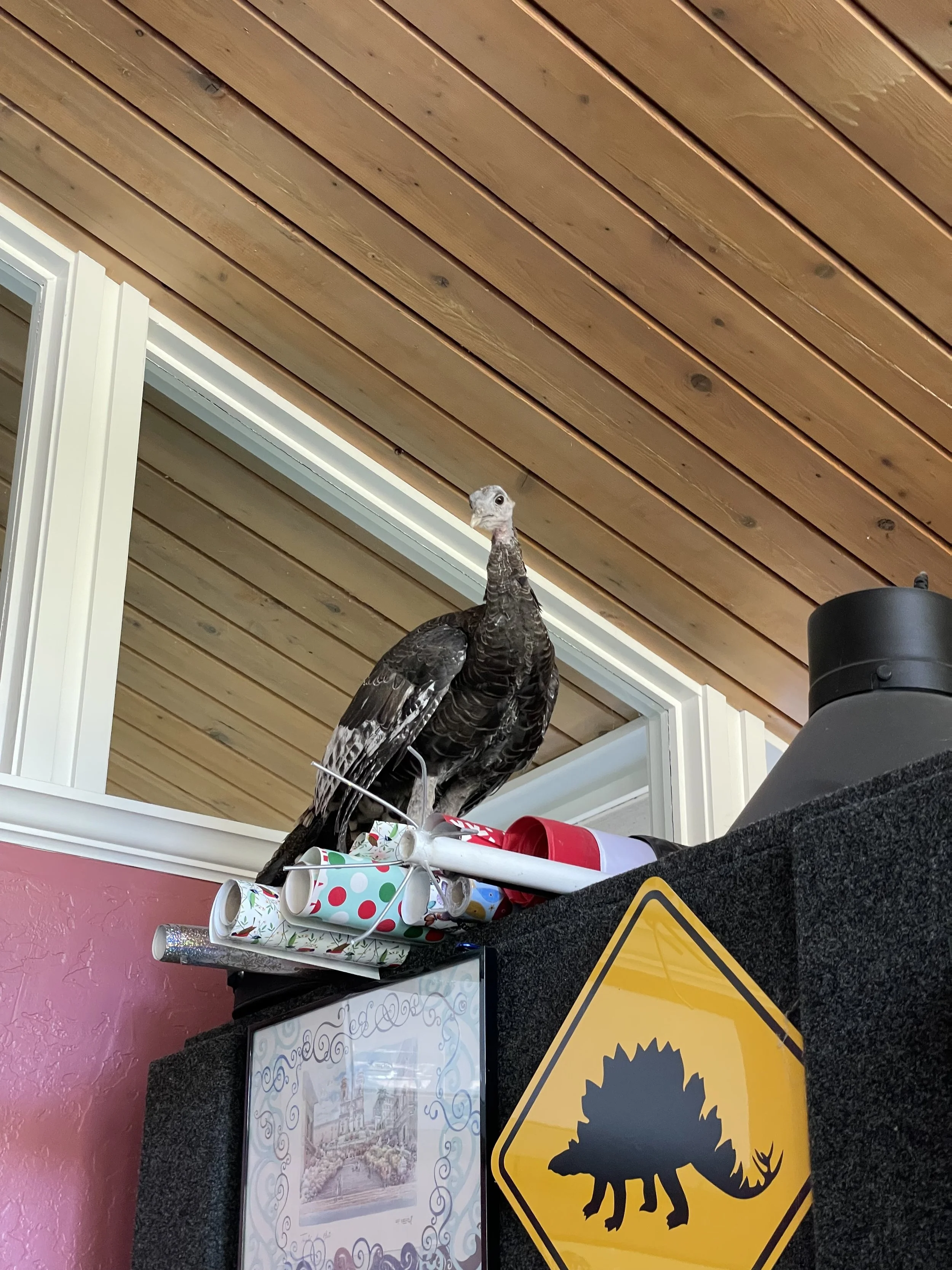 LC continues: “Our resident Red-tailed Hawks are now parking daily on the old mast pole, much to the consternation of the two Wild Turkeys we released here at the ranch. Orphans raised by the Wildlife Center of Silicon Valley where I volunteer, the pair were originally slated to join the wild flock that is usually in residence here, but of course since the day I brought home the foundlings, the usual small herd of truly wild turkeys has failed to show. This has created a few unusual moments like when one of the youngsters snuck into the house via the front doors and then proceeded to fly through the house and into my office. It took a good twenty minutes to convince her to leave the roof of my sound booth and exit the house. Unlike the polite feral peafowl that have shown a similar curiosity about human dwellings, the turkey decided to leave me a few ‘presents.’”