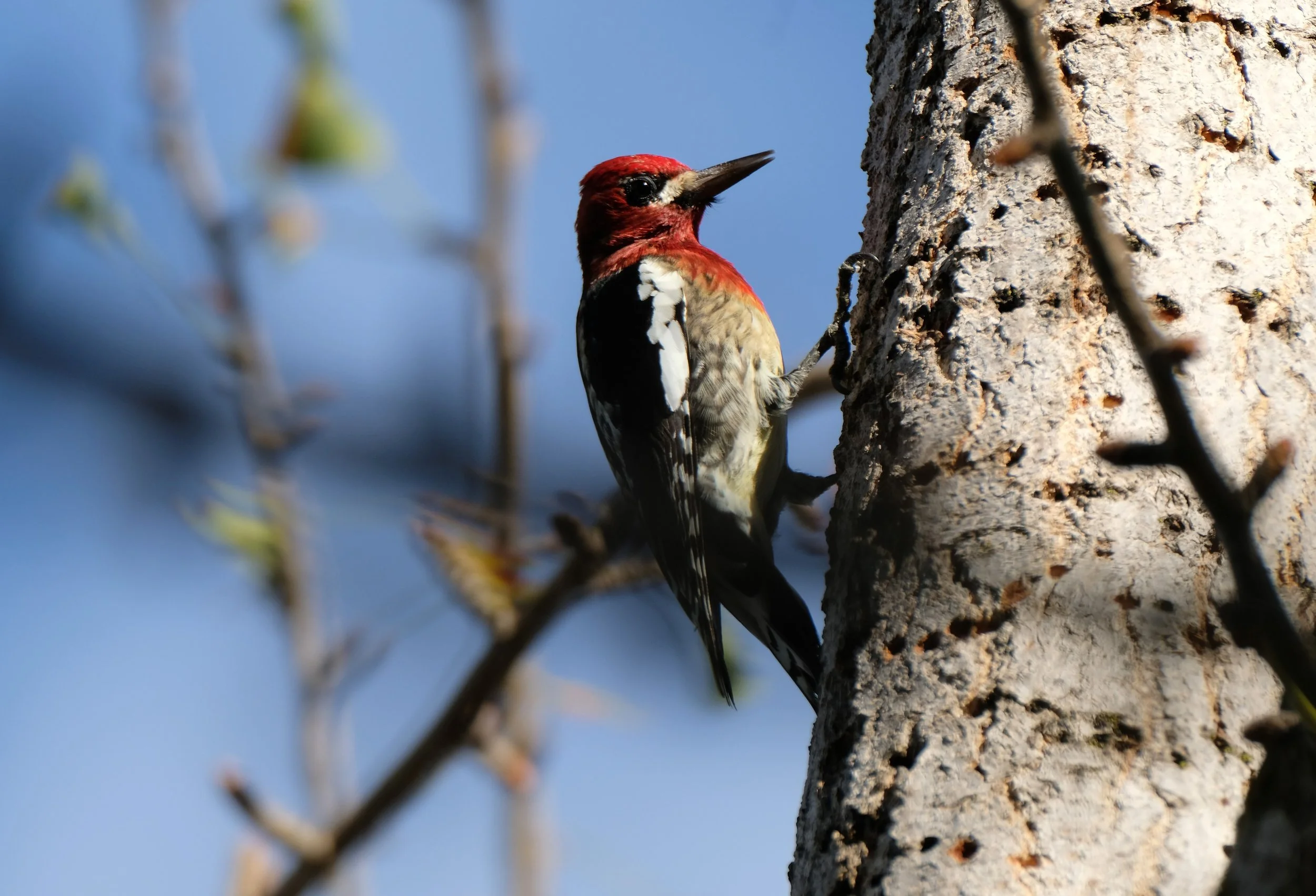 A Red-breasted Sapsucker spotted at a Milpitas park. These birds migrate here to spend their winters with us. They are recognizable by their deeply-saturated red head, neck, and breast.