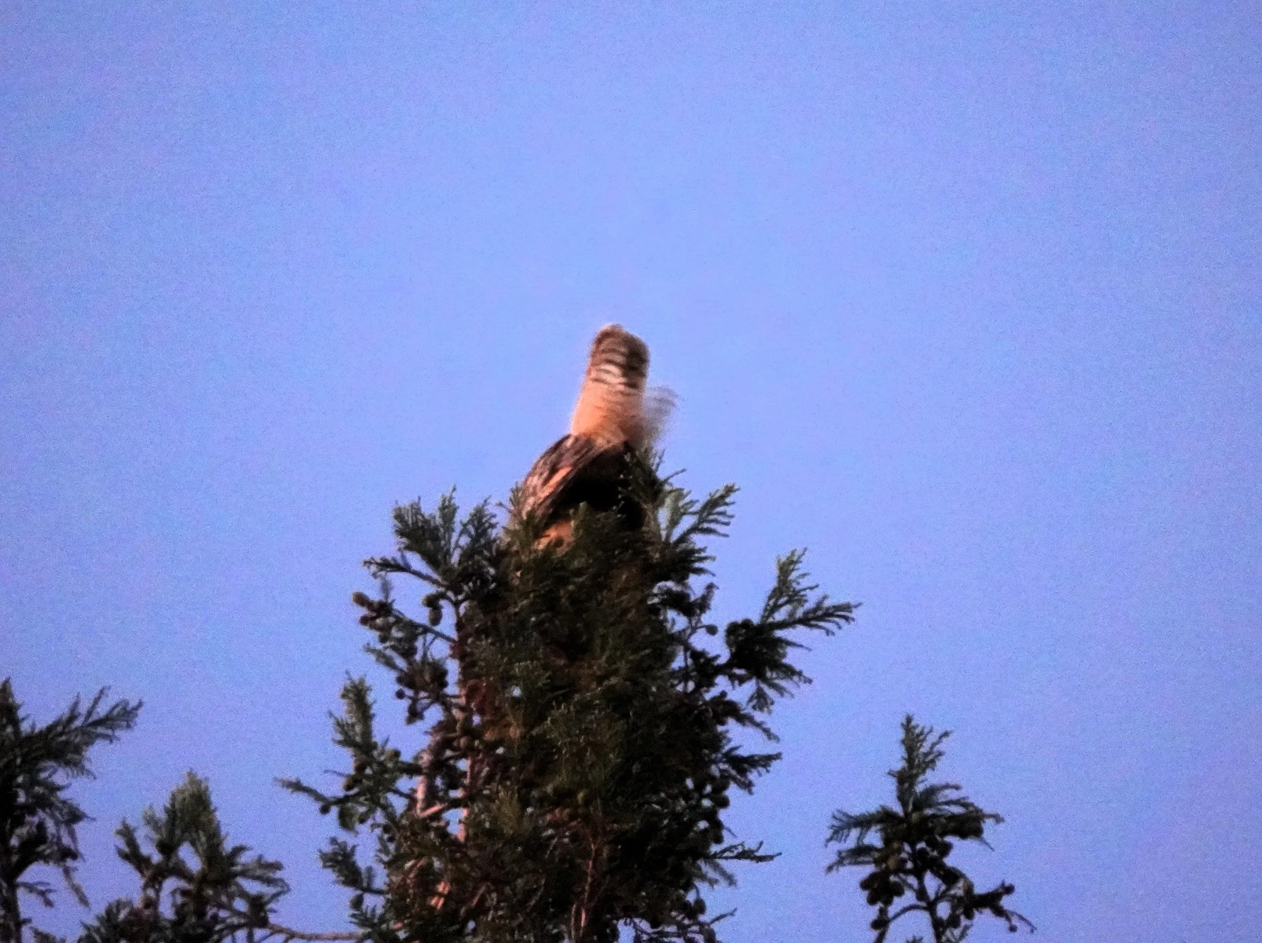 “Lately the Great Horned Owls from Ed R. Levin County Park have been coming to my neighborhood at night. I have heard them hooting in the middle of the night or near early morning. On October 28, right at sunset, a pair of Great Horned Owls perched on the tall redwoods and were dueting back and forth for 15 to 20 minutes before they flew away. I tried to take pictures in the coming darkness but later realized that the owl was facing us backwards. I got only some tail shots.”