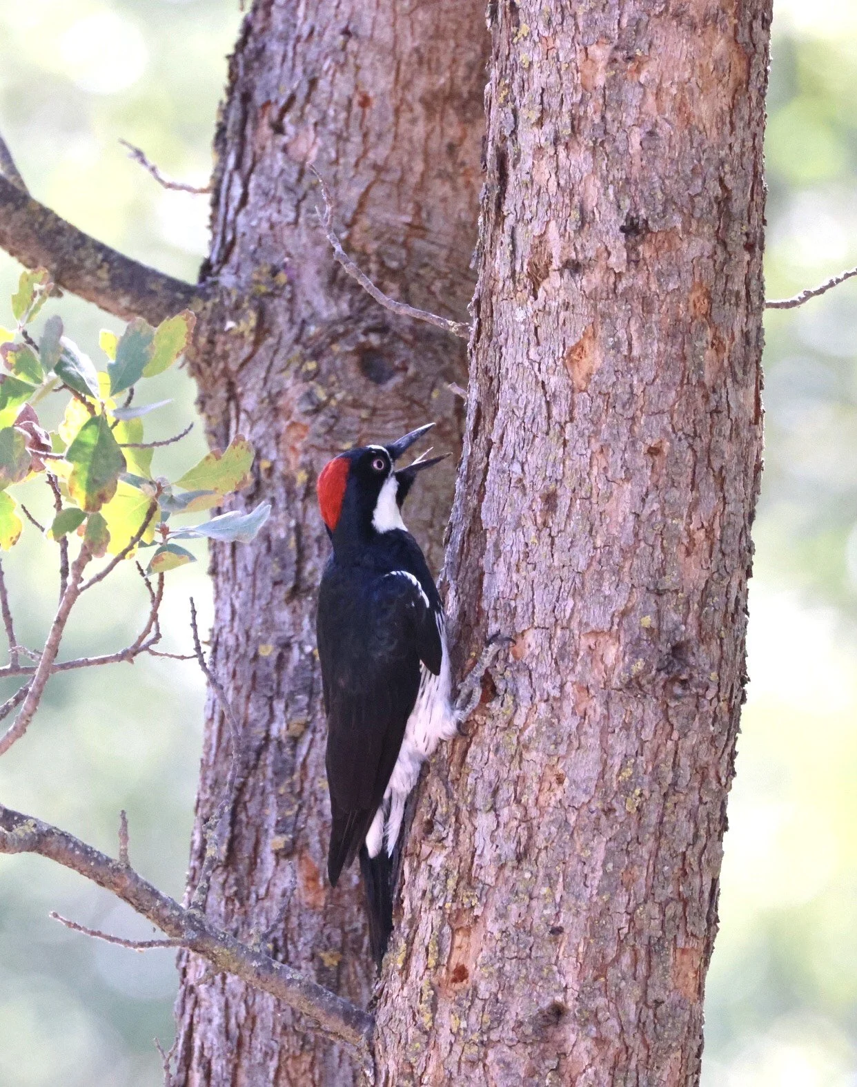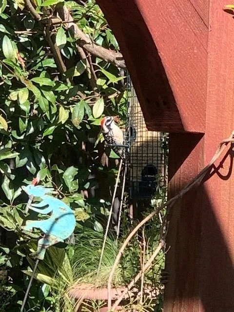 She continues: “During the hot spell in September we had a nice surprise. Our first Acorn Woodpeckers in the backyard that I’ve ever seen since we moved here! There are lots of them that live in the oak trees down in the creek at the end of the neighborhood, but I’ve never seen one in my yard.”