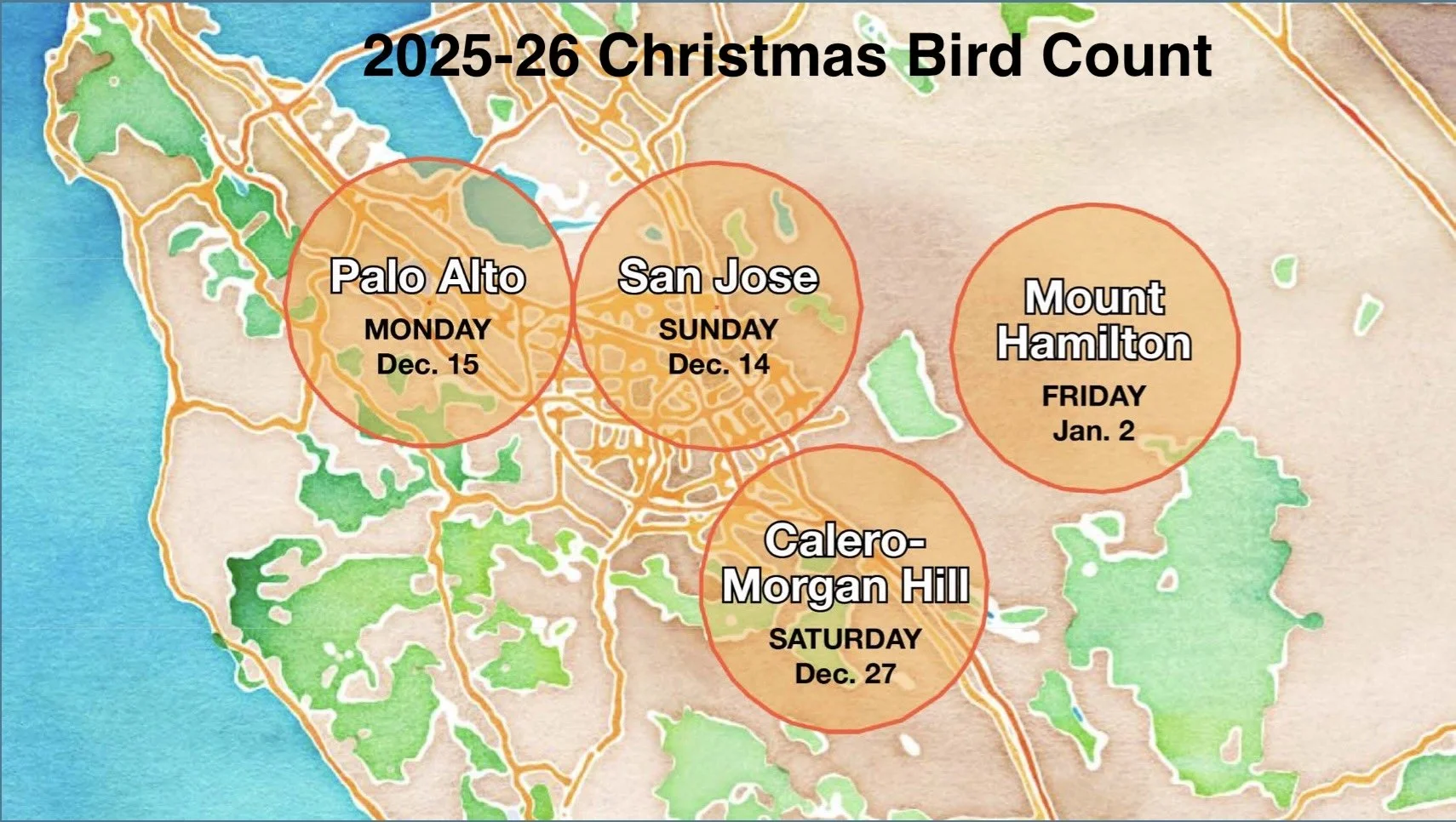 Nearly four hundred volunteers participated in this year’s annual Christmas Bird Counts (CBCs) sponsored by the Santa Clara Valley Bird Alliance. This community-science project gets experienced and new birders canvassing our varied habitats to record the number and species of every bird in a single day. Combined, this data along with CBCs across the country and around the world, provide a snapshot of the health of our bird populations and an ability to see the changes over time. SCVBA sponsors the San Jose, Palo Alto, Calero-Morgan Hill and Mount Hamilton counts.