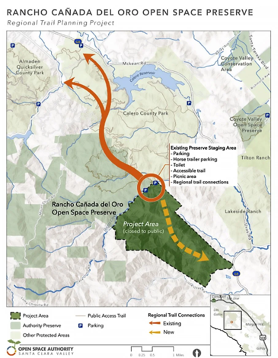 The purpose of the Rancho Cañada del Oro Open Space Preserve Regional Trail Planning project is to develop a plan for a trail network on the southern 1,800-acre portion of the Rancho Cañada del Oro Open Space Preserve, including an area formerly known as Blair Ranch. Access could support hiking, camping, mountain biking and horseback riding activities. This trail network would continue regional trail connections from the northern portion of the preserve.